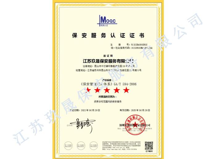 江蘇玖晟保安服務(wù)有限公司成立于江蘇省昆山市千燈鎮(zhèn)。注冊(cè)資金:5000萬(wàn),是擁有省公安廳頒發(fā)的保安服務(wù)許可證的企業(yè)【蘇公保服20170046】,也是昆山市保安協(xié)會(huì)常務(wù)理事單位。
